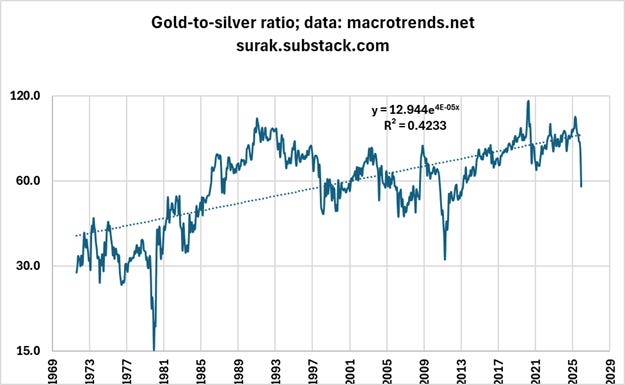 This ratio is far below the exponential trend. That means that silver is either way overpriced, or gold is underpriced. In any case, the “experts” who are forecasting silver at $300/ounce are way off base.
