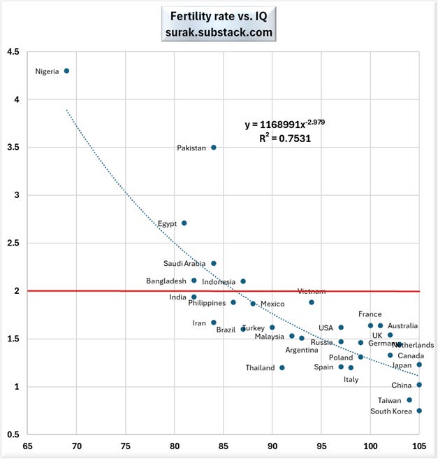 Average national IQ is on the horizontal axis, and fertility rate is on the vertical axis. I highlighted the dividing line for survival, which is usually defined as 2.1 to be on the safe side (accounting for childhood deaths), but which I drew at 2. Only 6 of the 31 major countries can replace their own population.